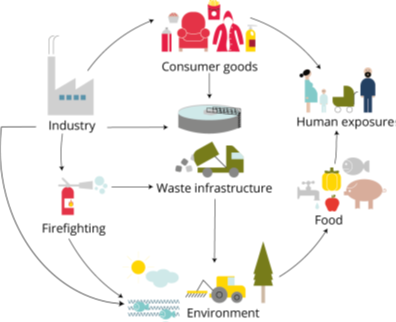 L’omniprésence des PFAS dans l’environnement entraîne de nombreuses voies d’exposition potentielles. La première source d’exposition pour la population générale est l’alimentation. Mais nous sommes également exposés par l’inhalation d’air, de poussières et le contact avec des matériaux contenant des PFAS.